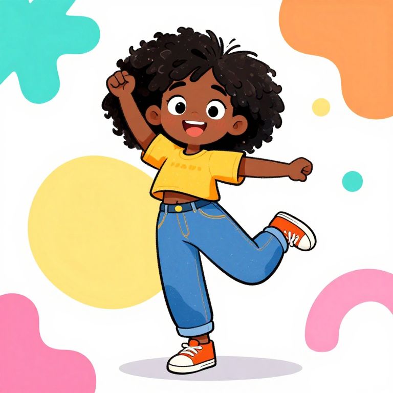 Cartoon black girl drawing full body, vibrant colors and playful style, wearing casual clothes, dynamic pose like jumping or dancing, bright background with abstract shapes, expressive face with big eyes and a joyful smile, detailed clothing textures