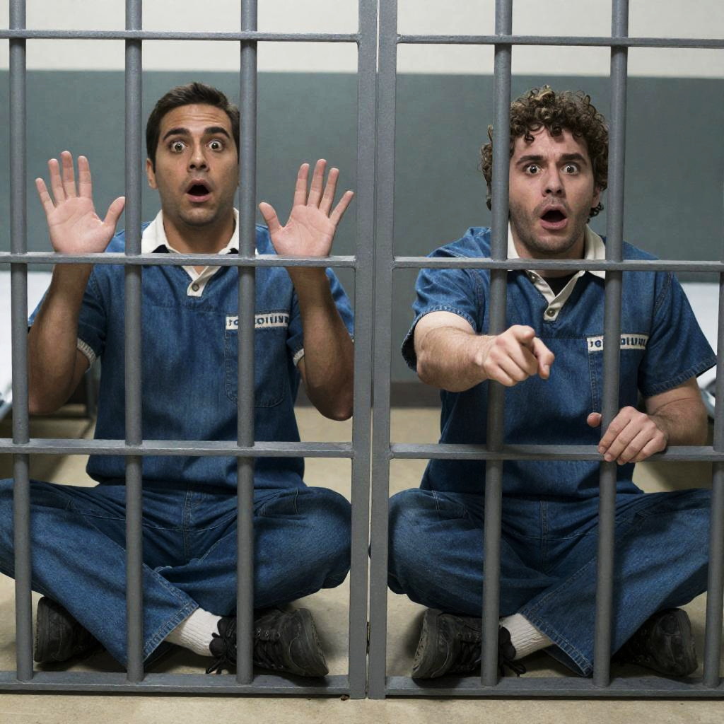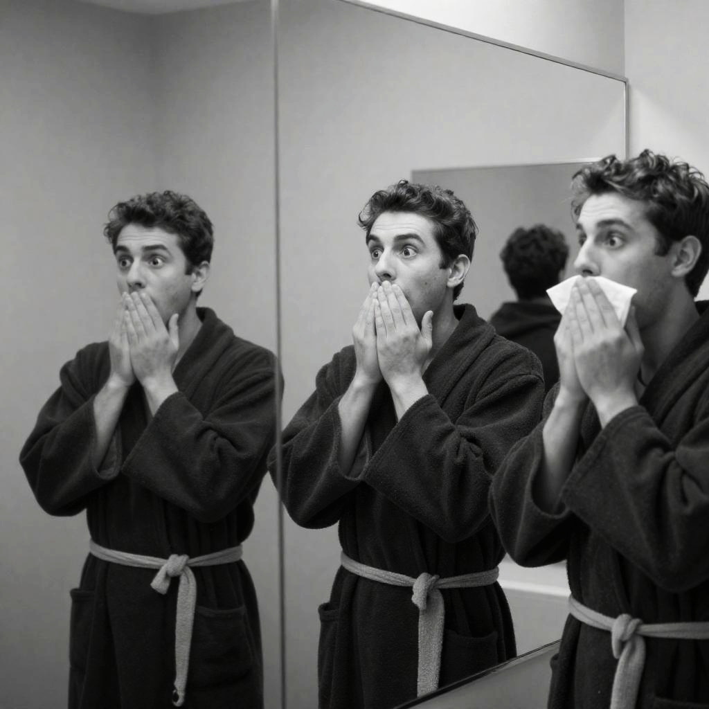 Black-and-white photograph of three men in a mirrored room. Each man stands in front of a mirror, covering their mouths with their hands. They wear dark robes with white trim. Mirrors reflect their shocked expressions. One man on the right holds a tissue. The men have short, dark hair and are positioned in a row.