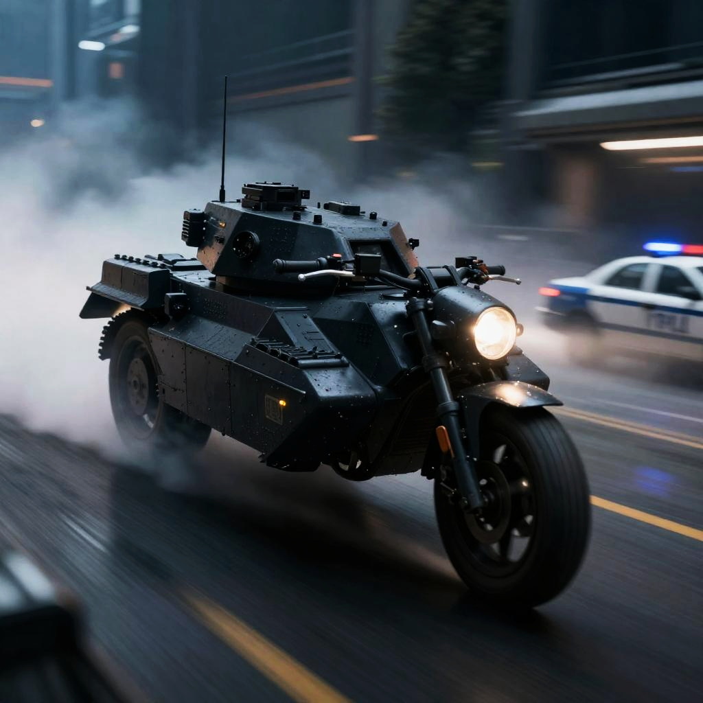 Black and black science fiction hovering tank military motorbike running away from a police car, science fiction, cinematic lighting, night time, volumetric light, imax, dslr, highly detailed, volumetric fog, dystopian vibes, dutch angle, cinematic angle