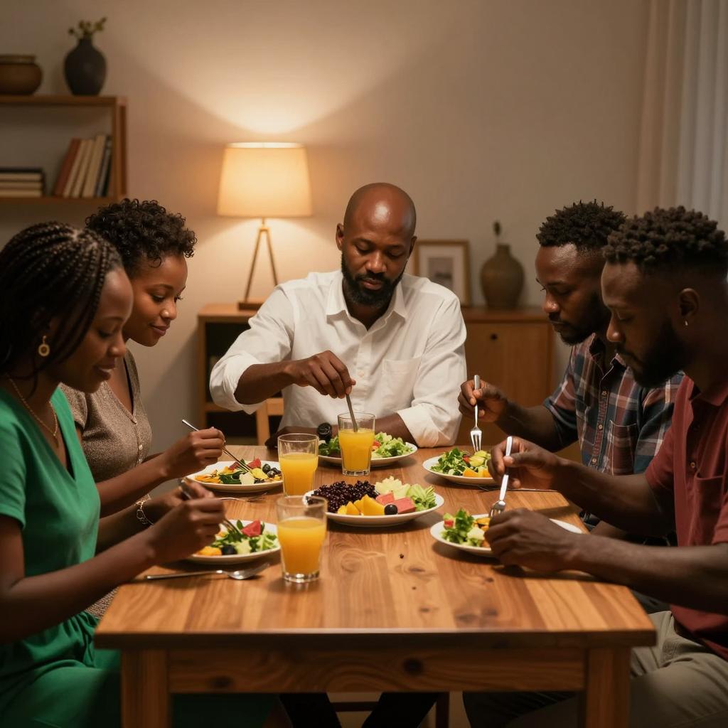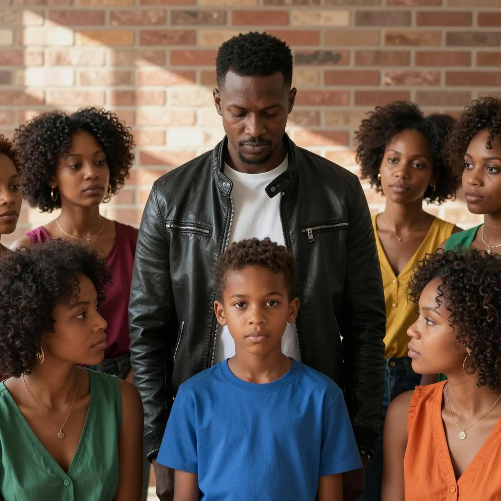 Black and white photo of five people in a kitchen setting. Foreground shows an angry Black man with short curly hair, wearing a white shirt and suspenders. Standing next to him is an elderly Black woman with curly hair, glasses, wearing a patterned shirt and white apron. In the background, a young Black woman with a headscarf, tank top, and apron stands with crossed arms, alongside a young Black man with short hair, and an elderly white woman with glasses. Kitchen cabinets, plates, and decorative vase visible.