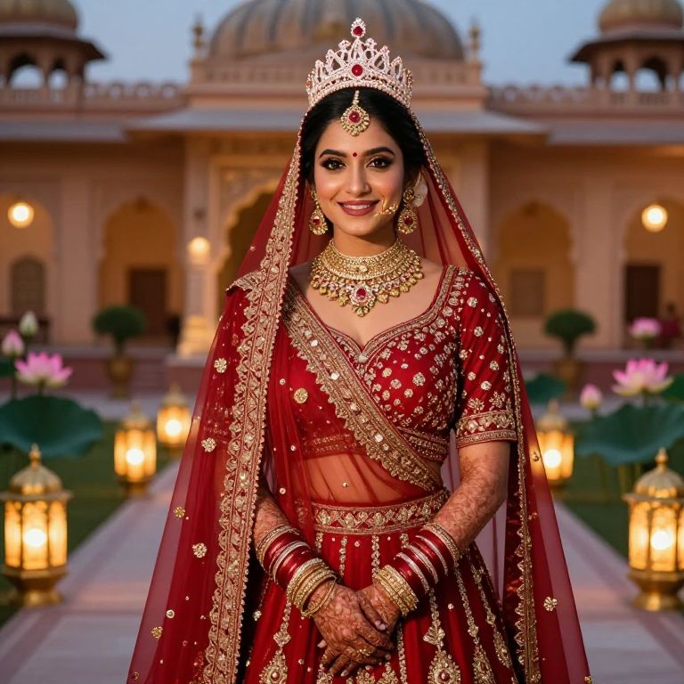 A stunning Indian bride wearing a royal red bridal lehenga with intricate gold zari work, traditional embroidered borders, and a towering ceremonial crown, standing in a grand palace courtyard at dusk with golden lanterns and lotus flowers in the background; she has soft golden-brown skin, large expressive eyes, and a confident, radiant smile; realistic photograph style
