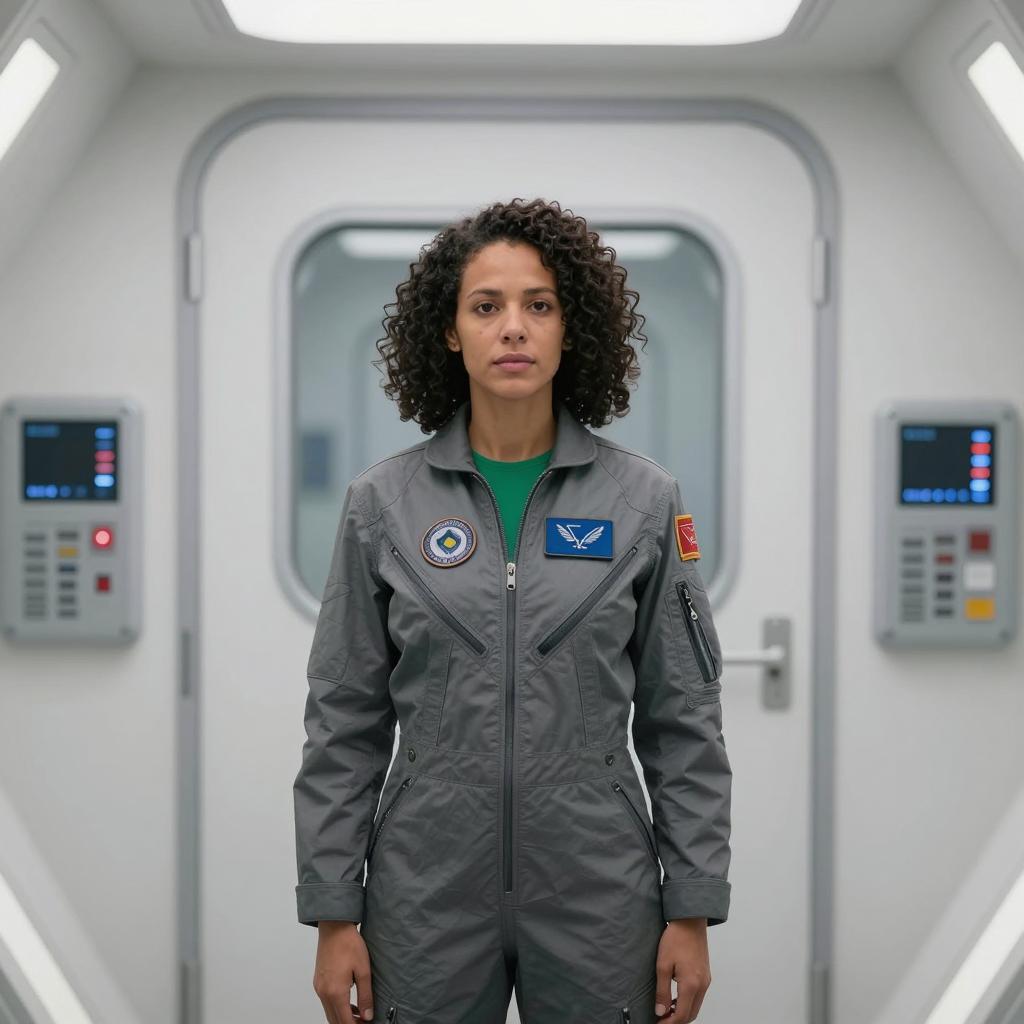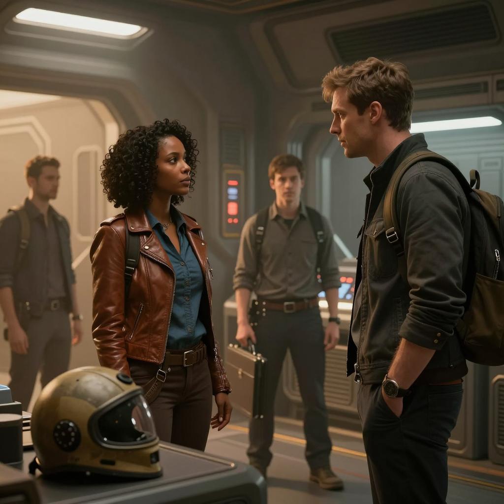 Two people inside a spaceship cockpit. A woman with curly brown hair, wearing a dark jacket with patches and a light shirt, leans forward. A man in a helmet with a visor looks at her from the right. The cockpit has glowing control panels and a damaged, reflective surface in the foreground.