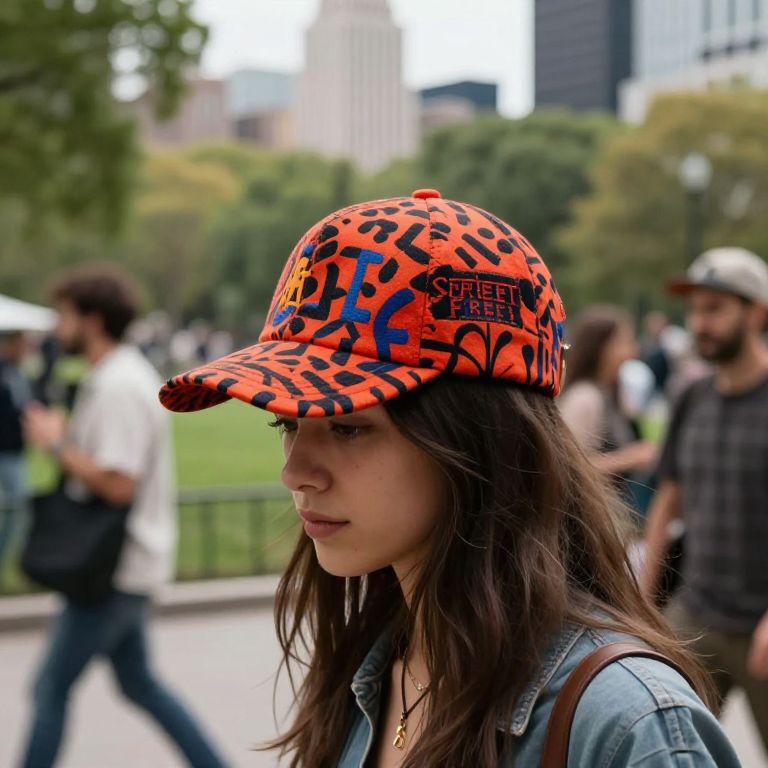 Fashionable street caps in a modern city park, people walking with bold patterns and unique designs, soft natural light, blurred movement, rich colors, midjourney style, urban fashion vibe, lifestyle photography.