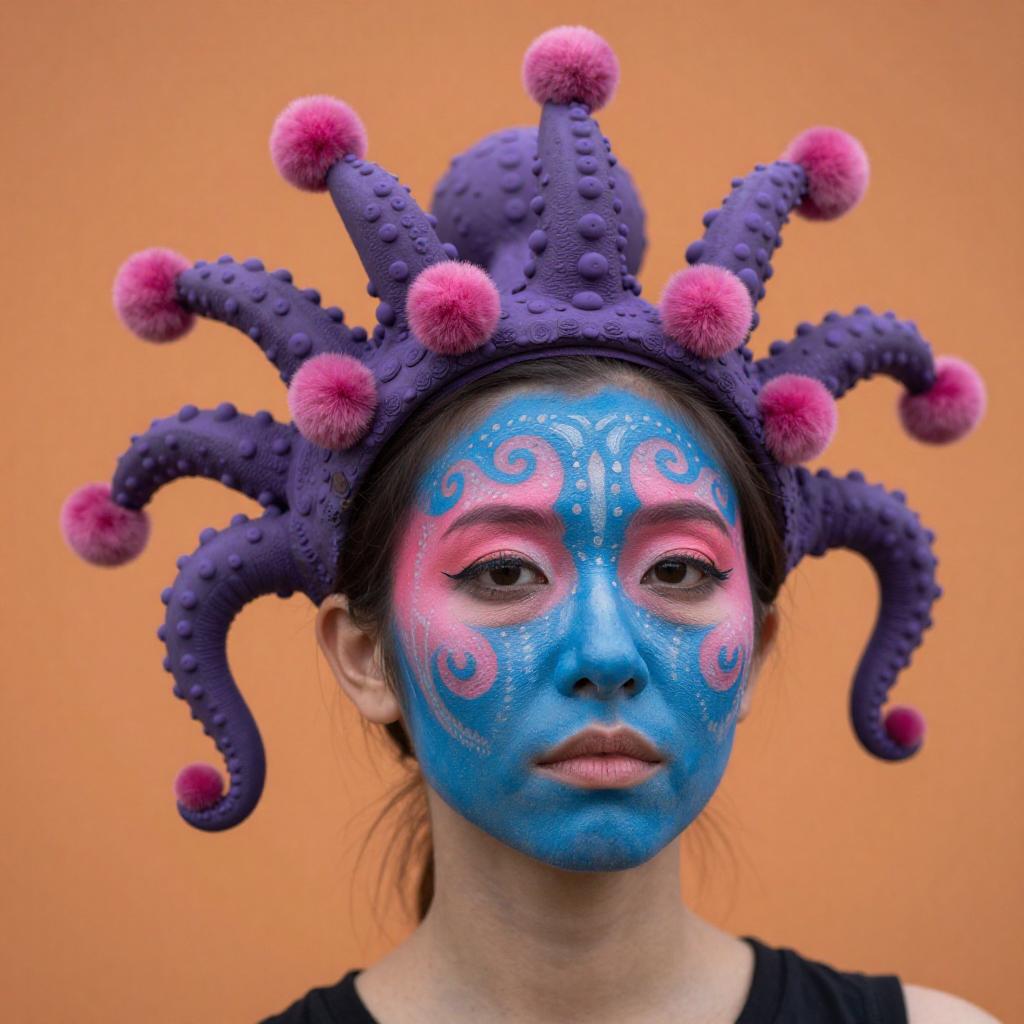 Photograph of a person with vibrant blue and pink face paint, wearing a fantastical headpiece with purple tentacle-like extensions adorned with pink pom-poms. Bright orange background is solid and unfocused. The subject's face is in sharp focus, showing detailed blue and pink patterns. Lighting is even, highlighting the vivid colors. Camera angle is slightly above eye level, creating a dramatic, upward look. Depth of field is shallow, keeping the face and headpiece in sharp focus while the background is blurred.