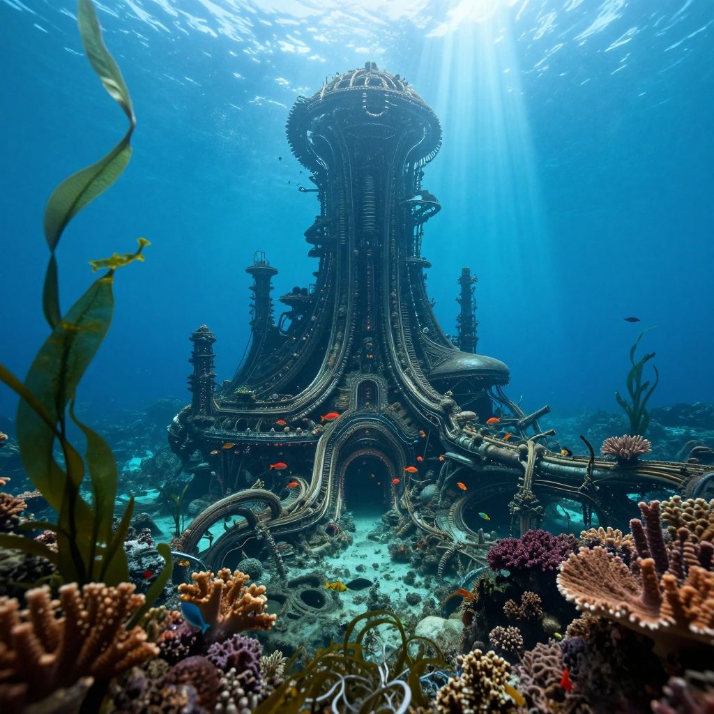 Photograph of an underwater, surreal, intricately carved, metallic castle with swirling, pipe-like structures amidst colorful coral reefs and small orange fish, bath