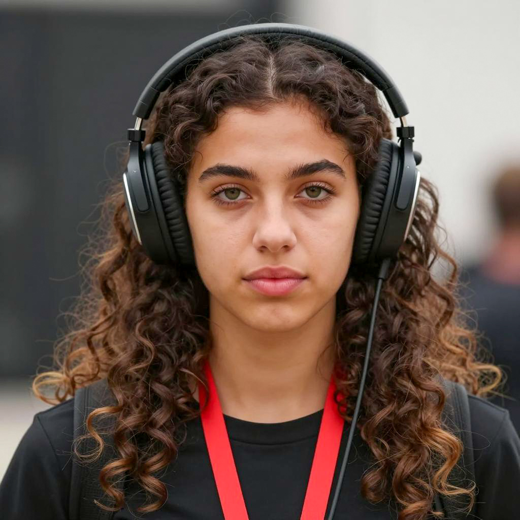 A woman with long curly brown hair, wearing a red headband, serious expression, looking slightly to the right. Background shows a large crowd, stadium seats, and a microphone stand. Bright yellow light illuminates the scene from above. Another person with a red headband and dark hair is in the background.