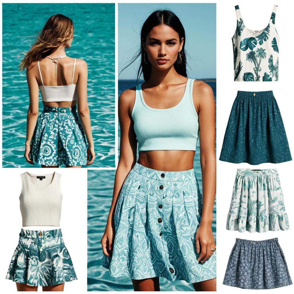 Create a moodboard for womens summer skirts for the upcoming summer season. The designs should be inspired by picturesque lagoon patterns as large, central motifs on the front of the tank tops. Draw inspiration from modern streetwear brands such as Zimmermann, Äeff Clothes, and Reformation to craft a stylish and contemporary aesthetic. Consider soft oceanic colors that evoke a relaxed yet fashionable summer vibe.