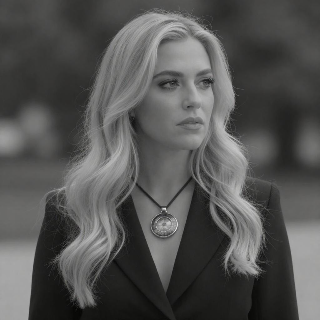 Black-and-white photograph of a blonde woman with long, wavy hair, wearing a black blazer and a large, circular pendant necklace. She gazes to the right with a serious expression. The blurred background suggests an outdoor setting with trees. Her makeup is subtle, emphasizing her eyes.