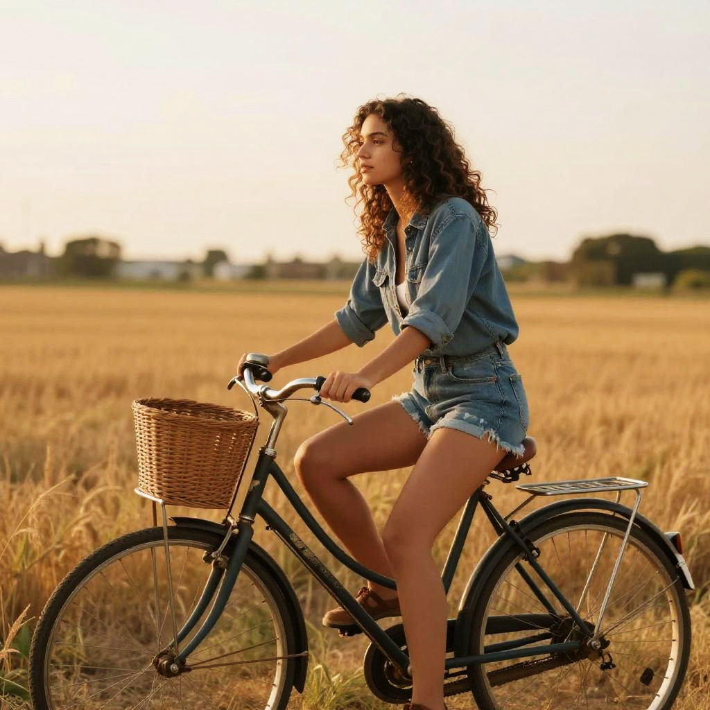 A young woman with curly hair wearing denim shorts and a denim shirt sits on a vintage bicycle with a wicker basket in a golden field at sunset. The image features warm natural lighting and soft depth of field, with a rural countryside background.