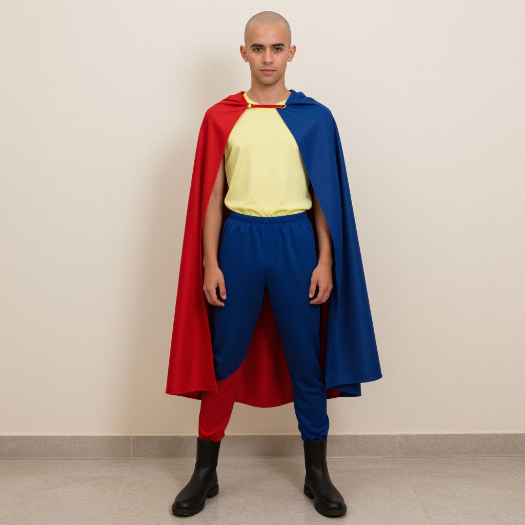 "bald boy costume, bald, 1boy, solo, male focus, full body, cape, standing, realistic, arms at sides, sneakers, pants, shoes, looking at viewer, simple background Realistic photo of casual sexy person with pretty face"