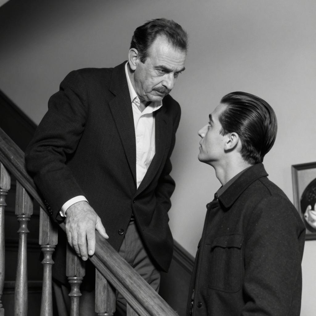 Black and white photograph of two men on a wooden staircase. The older man with dark hair, a mustache, and a suit leans forward with a serious expression. The younger man with slicked-back hair and a dark jacket looks up at him. The older man's left hand rests on the railing. The background shows a blurred object on the right.