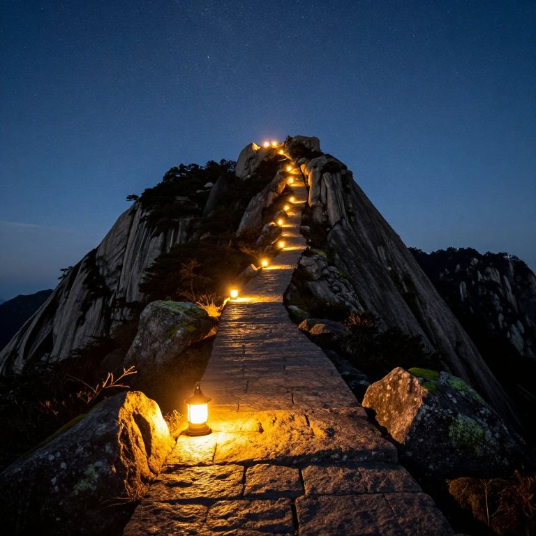Mountain peak bathed in radiant sunlight draws a trail of luminous lanterns along a winding stone path, casting golden glows that reflect off mossy rocks and illuminate the ascent toward the starlit sky above.