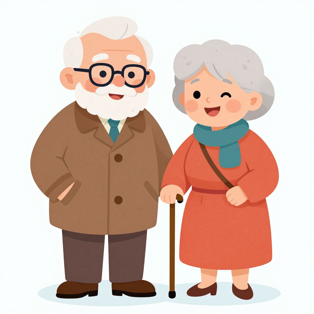 A cheerful cartoon-style illustration depicts an elderly couple, featuring a man in a brown coat and glasses, and a woman holding a walking cane, both wearing vibrant clothing and exuding warmth and happiness.