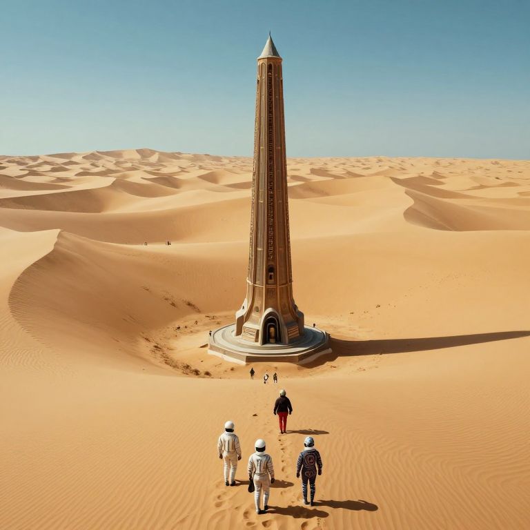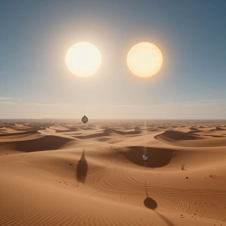 A captivating digital artwork depicts an ethereal desert vista under a dual-sun sky, where surreal, drooping timepieces cascade over the arid terrain. This aerial view showcases intricate sand patterns, a visual testament to the enigmatic forces at play in this dreamlike expanse. The piece masterfully captures a blend of serenity and unease, inviting viewers into an otherworldly realm that stirs both wonder and trepidation.