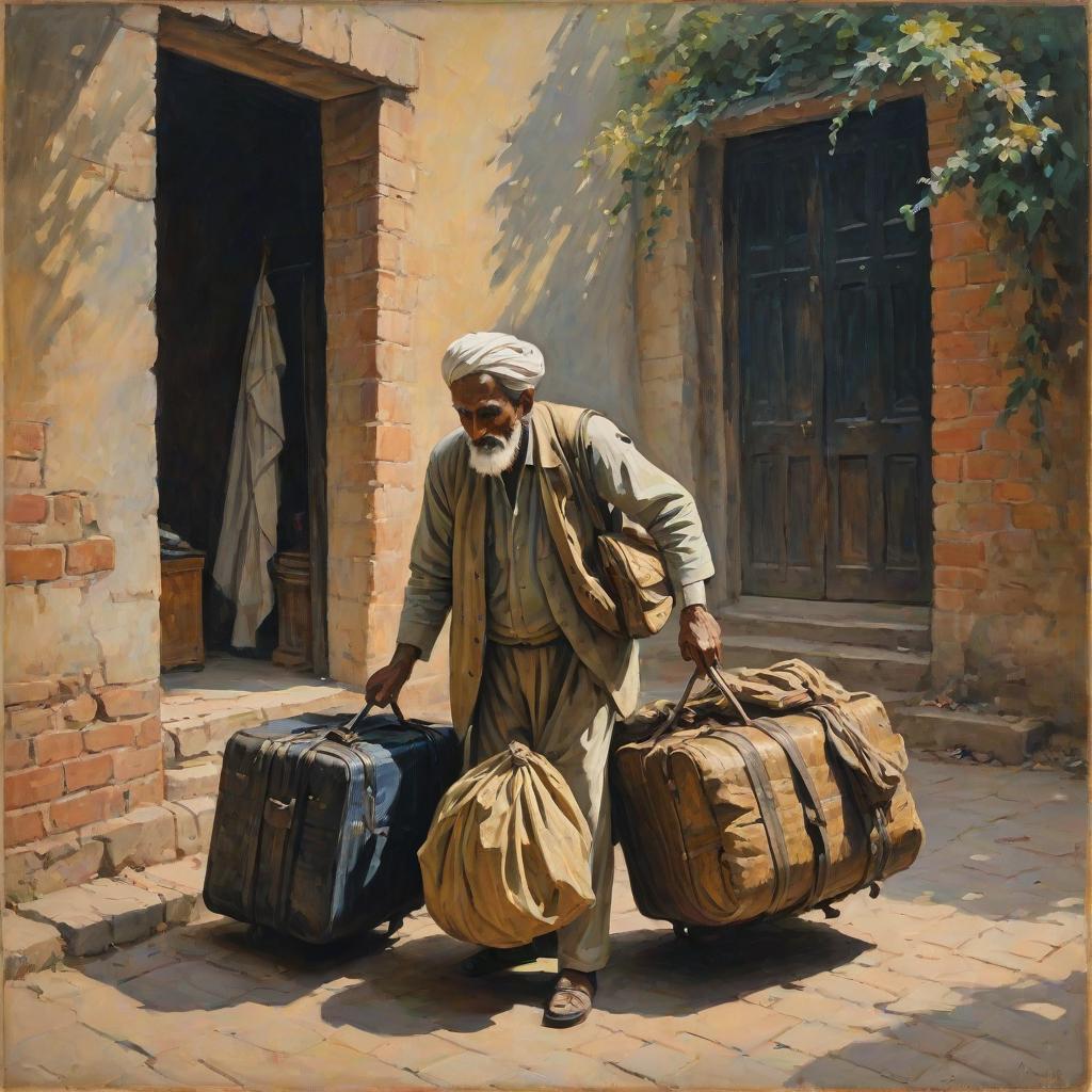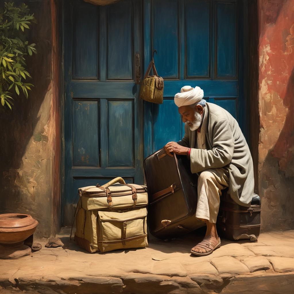 18th century. A dramatic moment where an elderly south asian man packs up all his things into a luggage and is about to leave his home in Delhi. It in the style of Claude Monet’s Impressionism.