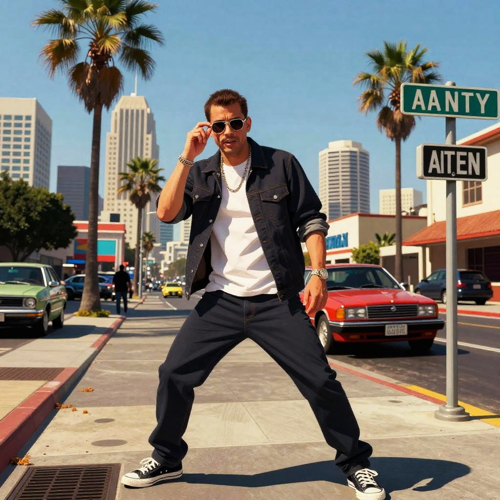 Turn photo into GTA style, comic book inspired, strong chiaroscuro effect, saturated colors with retro 90s gaming feel, urban skyline with palm trees and street signs, dynamic action pose