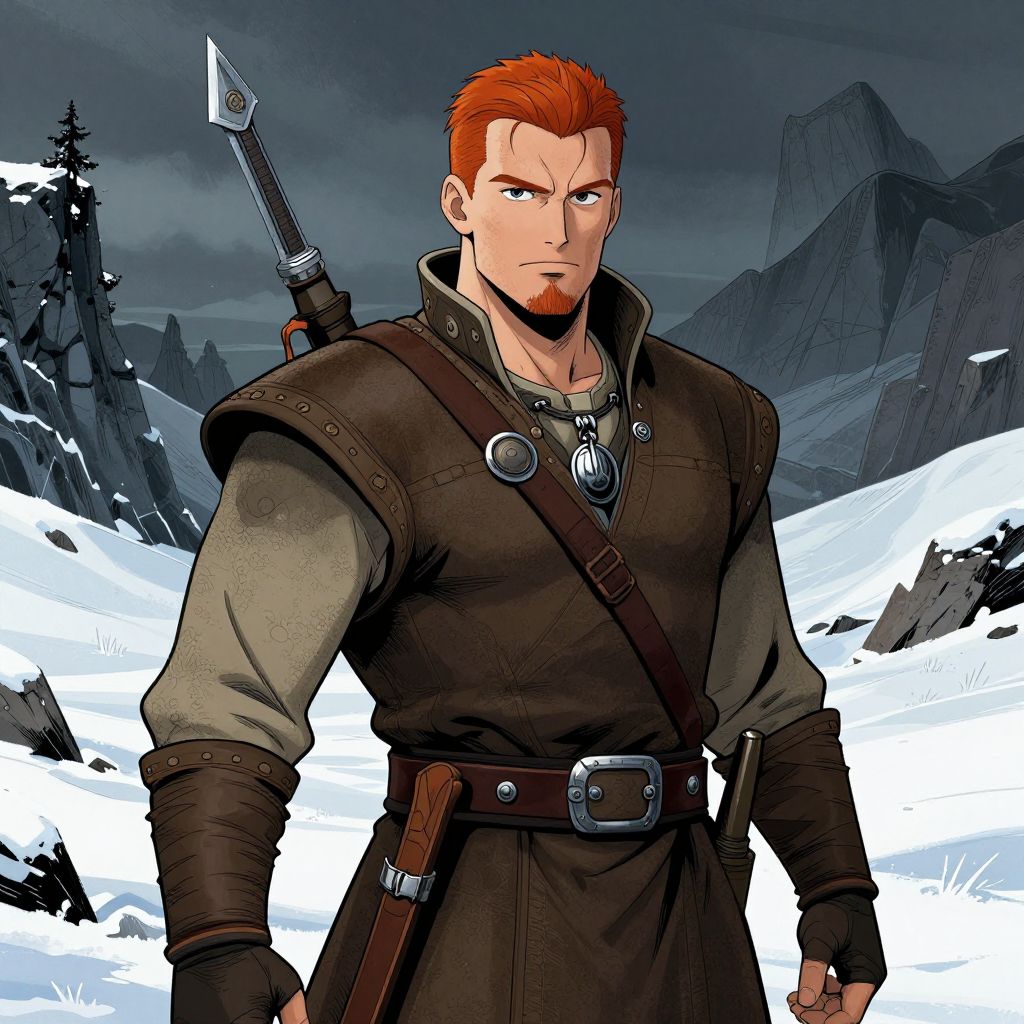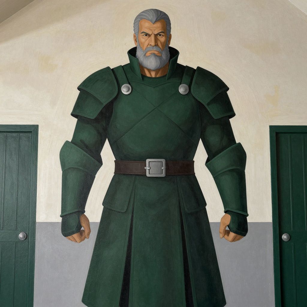 Mural a human male, dark green styled armor, grey beard and hair, tall, severe, jailor; in a garrison,