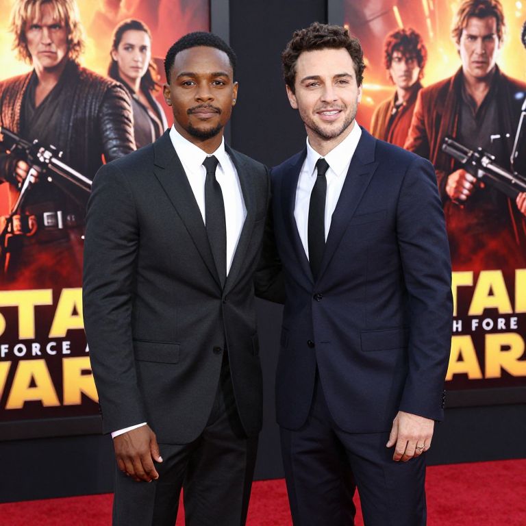 Actors John Boyega and Oscar Isaac stand together on the red carpet at the World Premiere of *Star Wars: The Force Awakens* on Hollywood Boulevard, December 14, 2015, with promotional posters featuring characters and the film's title visible behind them.