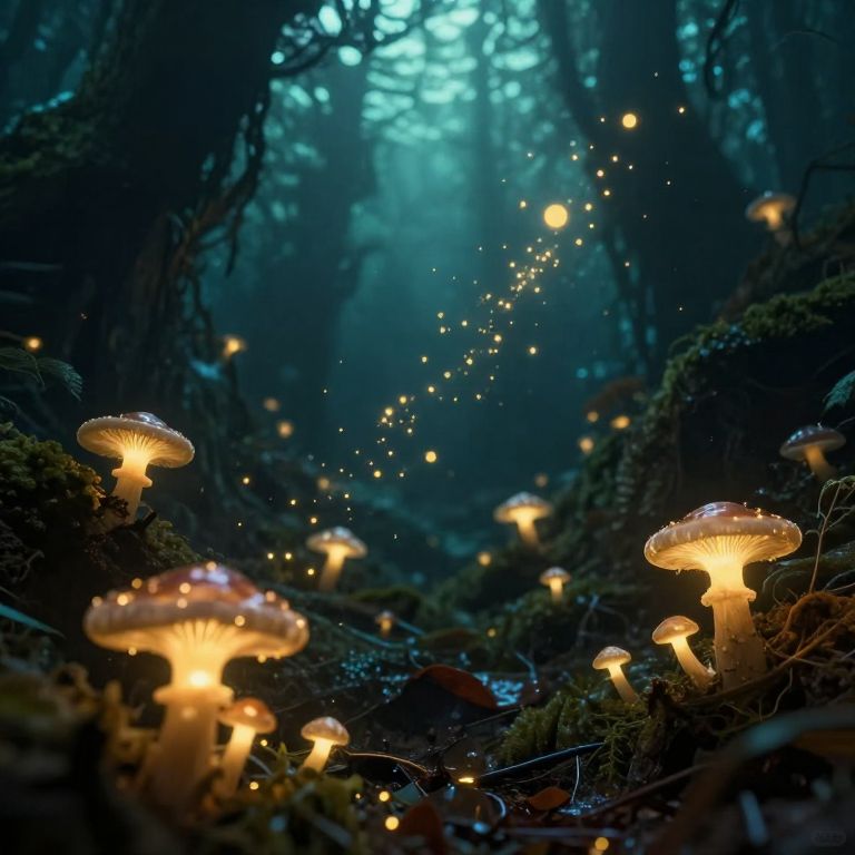 Photograph of a mystical forest at night, illuminated by glowing mushrooms and sparkling fireflies, with a misty blue background.