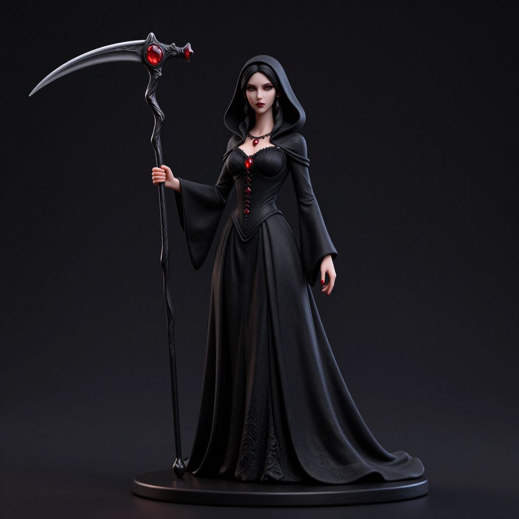 A gothic-inspired 3D-rendered figurine by Anne Stokes, featuring a woman in a flowing black gown and hood, holding a scythe with a striking red gem, set against a dramatic dark background, capturing the essence of high-definition fantasy art.
