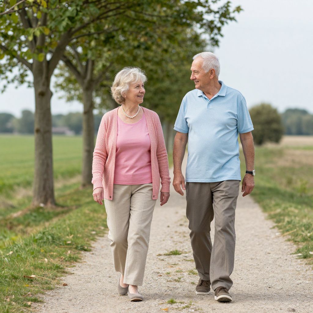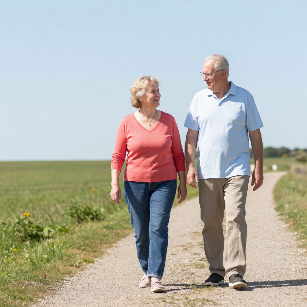 Senior woman and man having a walk along path in the countryside royalty free stock image