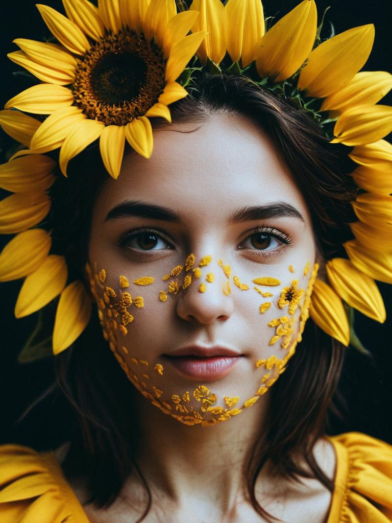 Close-up portrait of a young woman with straight brown hair wearing a vibrant yellow sunflower headpiece and matching yellow outfit. Two small yellow flowers are adhered to her cheeks, with a dark background highlighting the bright sunflower petals surrounding her face.