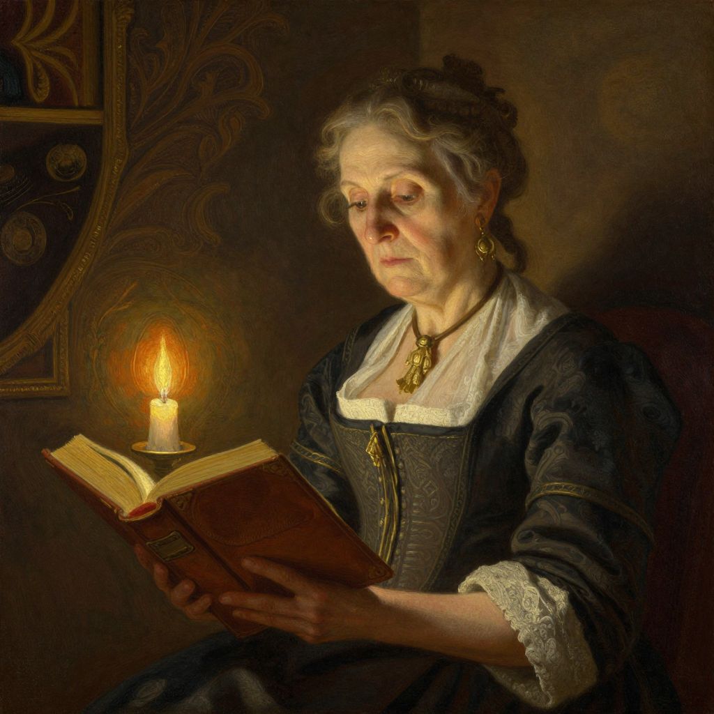Baroque-style painting of an elderly woman with white hair, dressed in a dark, ornate dress, reading a book by candlelight.