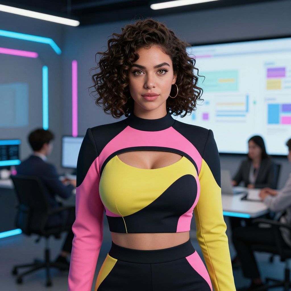 Photograph of a young woman with medium brown skin and curly dark brown hair standing in a modern office with neon lights. She wears a tight, long-sleeve, high-neck crop top with bold pink, yellow, and black geometric patterns, revealing ample cleavage. Her expression is confident, with dark eyes and subtle makeup. In the blurred background, two people sit at desks, working on computers. A large screen displays colorful, indistinct data or graphics. The office has a sleek, futuristic design with blue and pink neon lights accentuating the space.