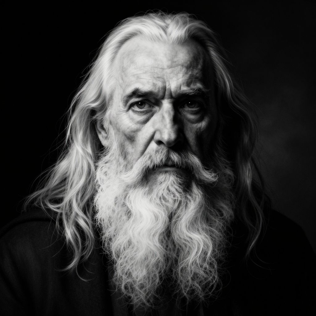 Beard graphic portrait of a wise elder with a long, flowing beard, illustrated in a chiaroscuro style with strong lighting contrasts, detailed facial features drawing attention to the texture and volume of the beard, evoking a sense of mystery and wisdom.