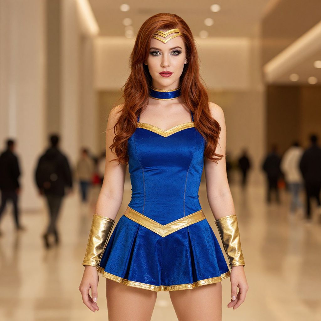 "Wondergirl Cosplay Fancy Dress, woman in a blue and gold costume standing in a hall"