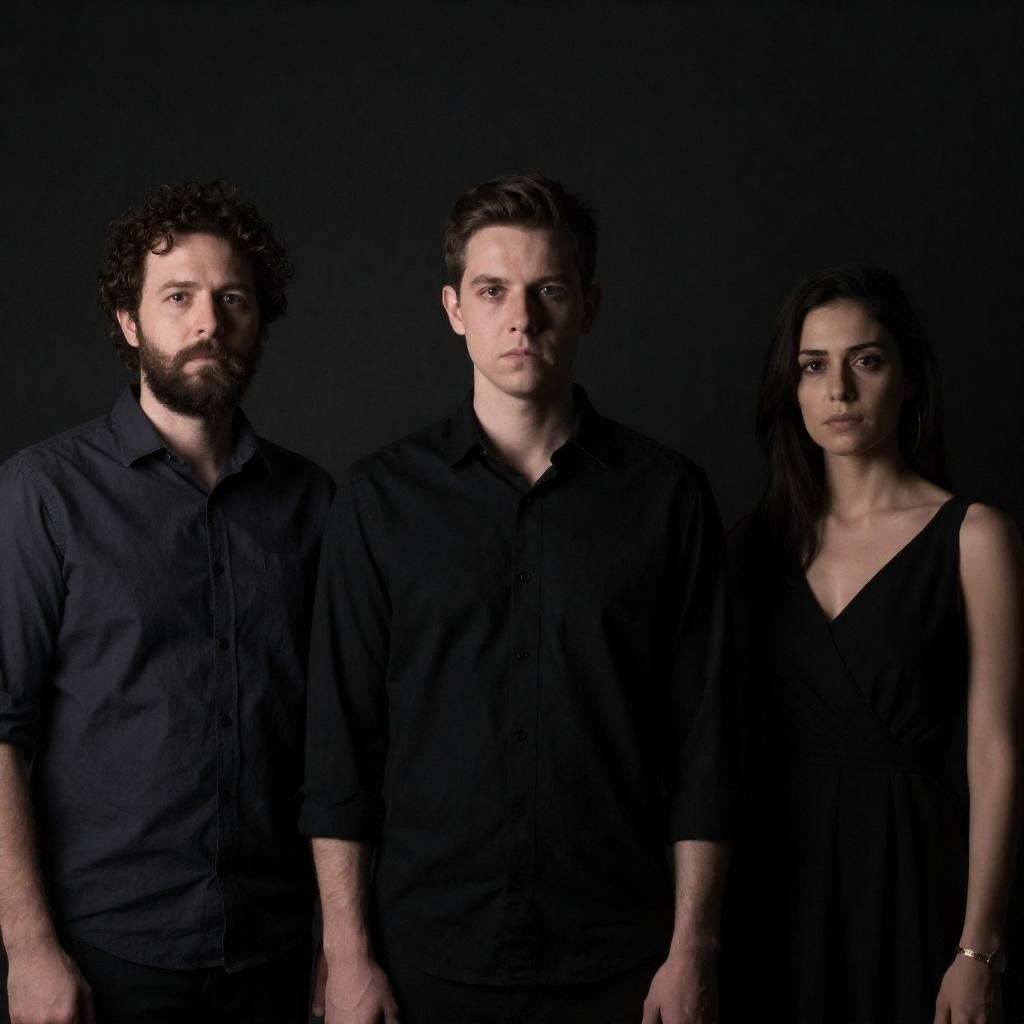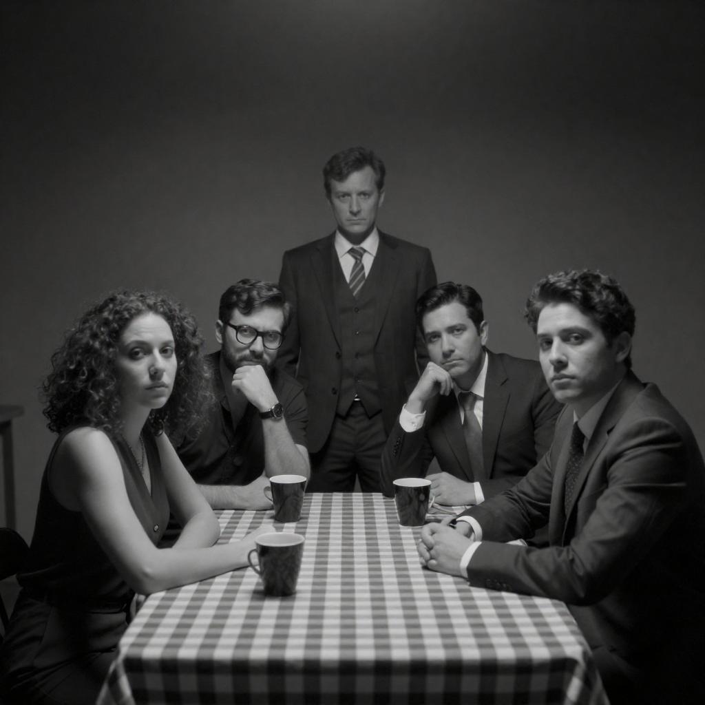 Black and white photograph of five people in a dimly lit room. Four seated at a table with a checkered tablecloth, one standing. Seated people: woman with curly hair, man with glasses, man in suit, woman with hair up. Standing man in suit with a vest. Table has cups and a book. Intense expressions.