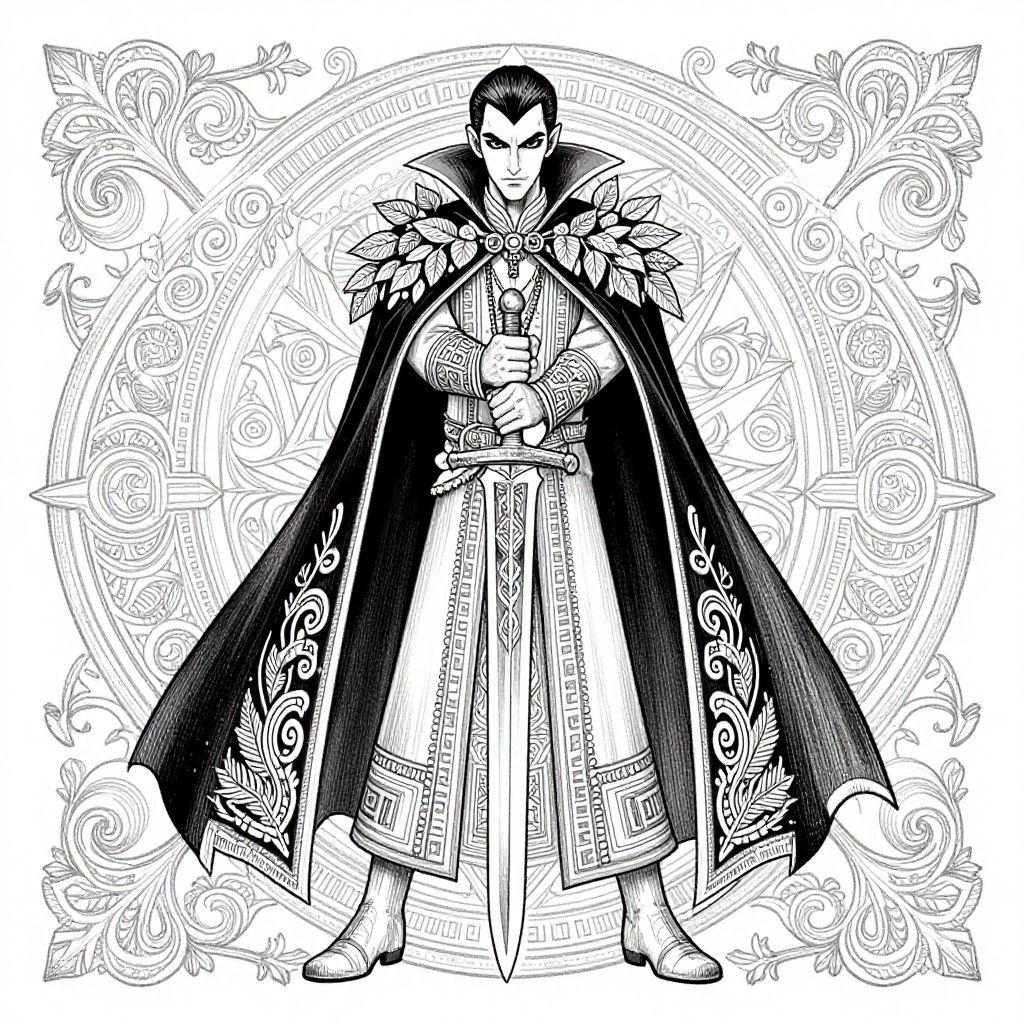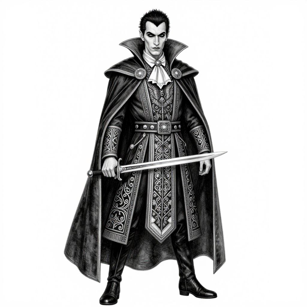 Black-and-white digital drawing of a tall, dark-haired male vampire in ornate, medieval-style cloak and armor, holding a sword, standing confidently.