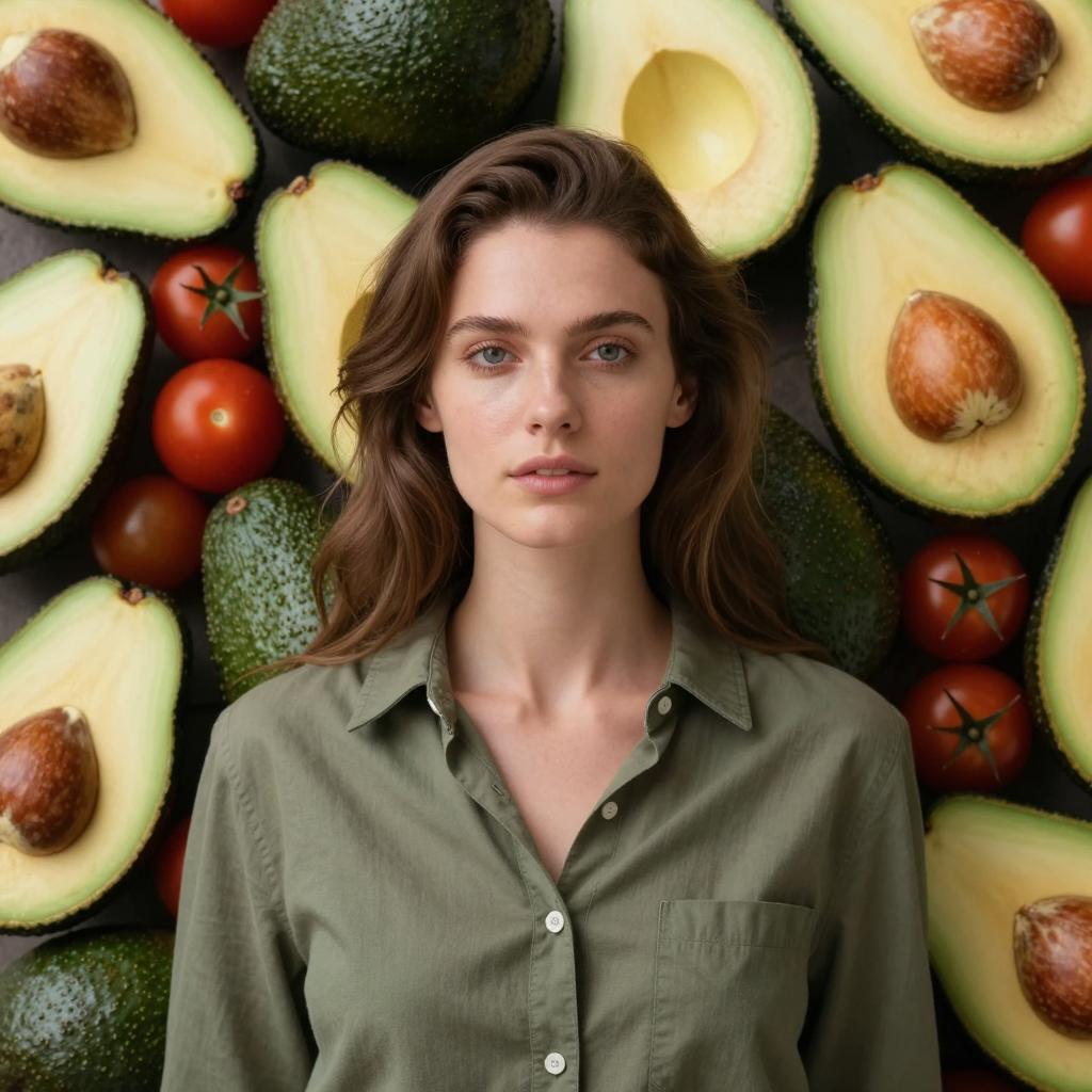 Avocado, photograph, woman with long wavy brown hair, olive green button-up shirt, standing in front of a background filled with avocados and cherry tomatoes, avocados sliced in half showing brown seeds, realistic style, natural light, soft shadows, neutral expression, centered composition, rich green and red colors, avocados and tomatoes arranged in a dense pattern, model has fair skin and symmetrical facial features, digital art with high detail, soft ure on avocado skins, realistic fruit ures