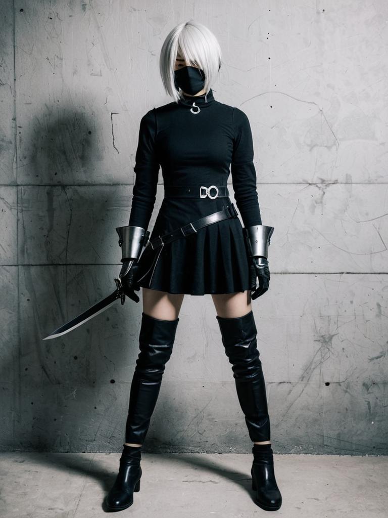 Photograph of a female cosplayer dressed as 2B from the video game "NieR: Automata." She has a short, platinum blonde bob and wears a black mask covering her nose and mouth. Her outfit includes a black, long-sleeved, high-neck top, a short black skirt with a "CO" belt, black fingerless gloves, and thigh-high black boots. She holds a katana in her right hand. The background is a textured, gray concrete wall, adding a gritty, industrial feel. The lighting is high contrast, emphasizing her dark attire and creating a shadow on the wall behind her.