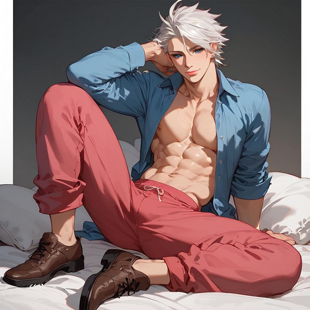 Ryuuzakikenichiro, solo, abs, open shirt, pectorals, muscular, pink pants, blue shirt, collared shirt, brown footwear, full body, sitting, seductive smile, score_9, score_8_up, score_7_up, anime