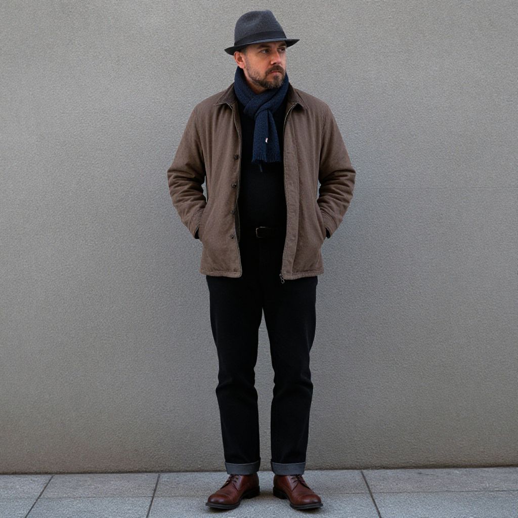 A man with a hat, a scarf, a brown jacket, a black shirt, black pants, and brown shoes is standing with his hands in his pockets.