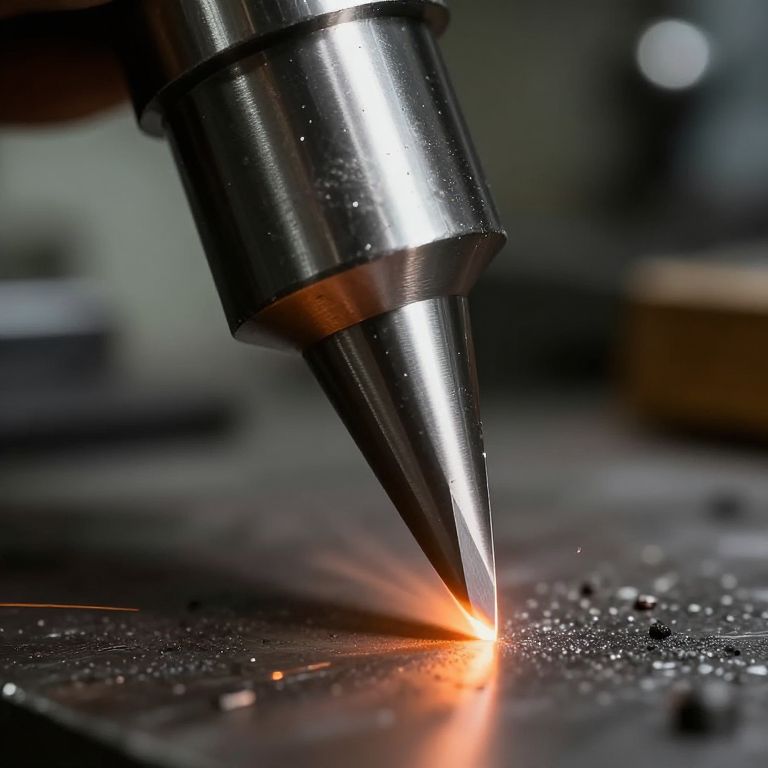Abstract close-up of a broacher tool's cutting edge, highly detailed metal textures, glowing hot steel, dynamic shadows, industrial workshop background blurred, emphasizing precision engineering and craftsmanship, hyper-realistic style.