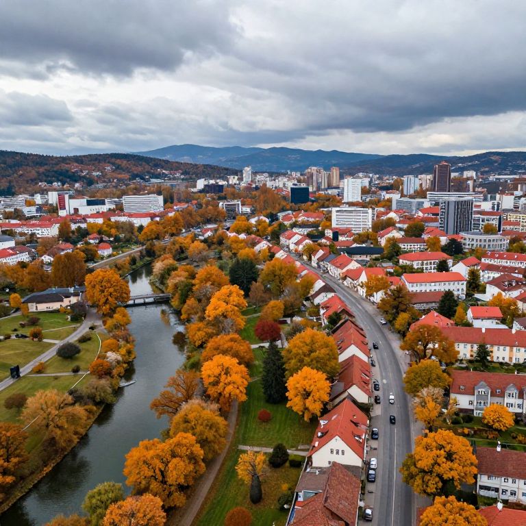 Aerial view of Rousse during autumn, golden and orange foliage scattered over the city parks and riverbanks, old red-roofed houses nestled between winding streets, distant mountains framing the horizon under a dramatic cloudy sky.