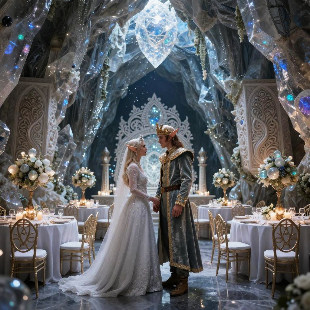Elf themed wedding reception inside a crystal cave, luminous gemstones illuminating the space, bride and groom dressed in regal elven fashion, ornate elven motifs carved into walls