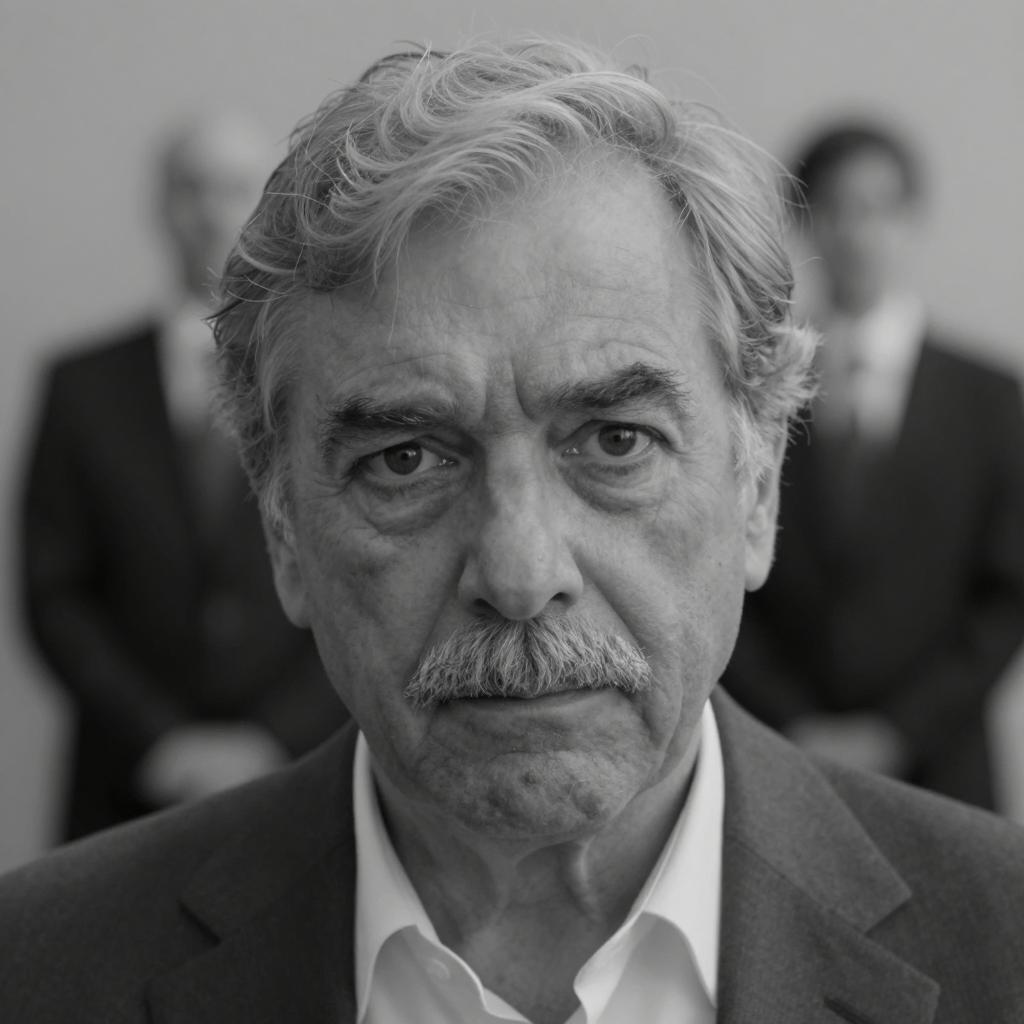Close-up of a middle-aged man with short grey hair, wearing a light-colored dress shirt and patterned tie. He is pointing his right hand towards the camera with an intense expression and furrowed brows. The background features horizontal blinds and a wooden wall, suggesting an indoor office or formal environment.