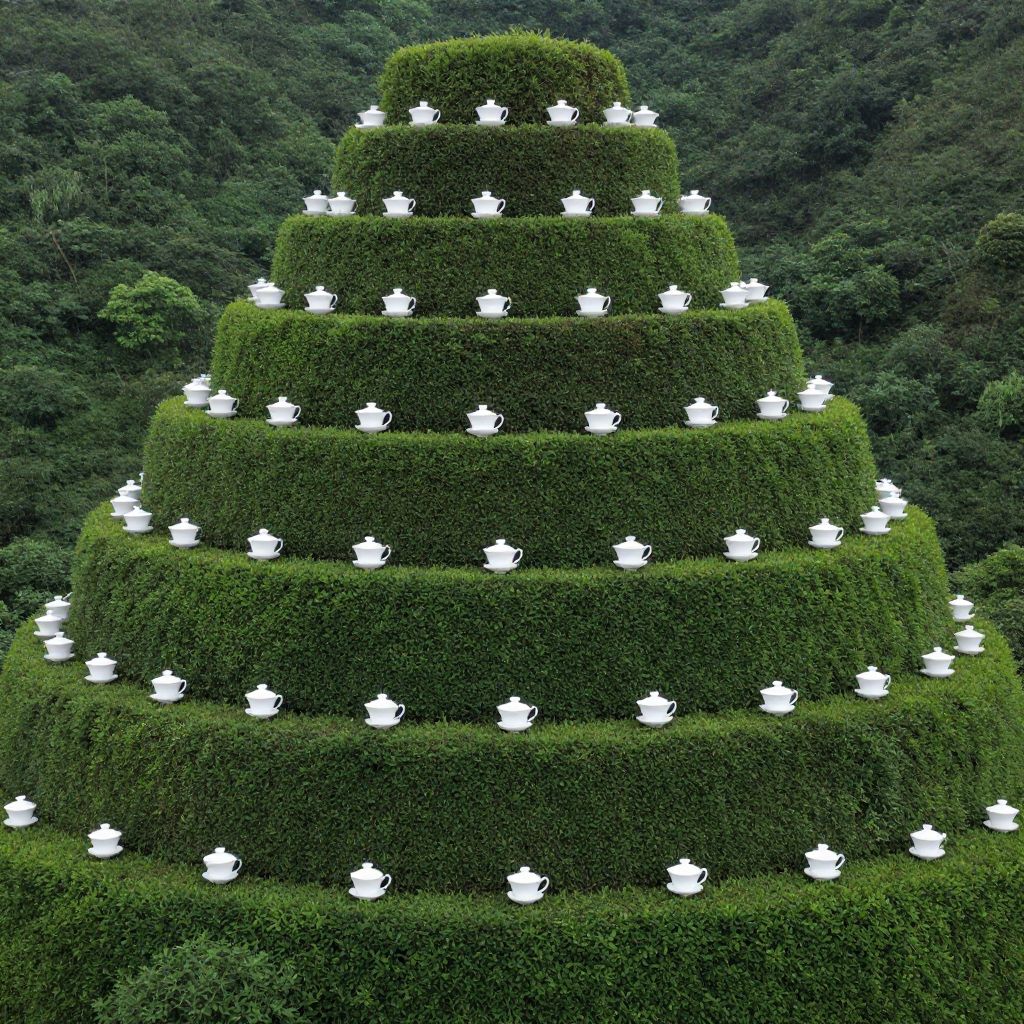 A verdant mountain ascends in tiered layers of lush greenery, each level adorned with perfectly placed white teacups, defying gravity and inviting the viewer into a whimsical world where nature and human artifacts merge in surreal harmony.