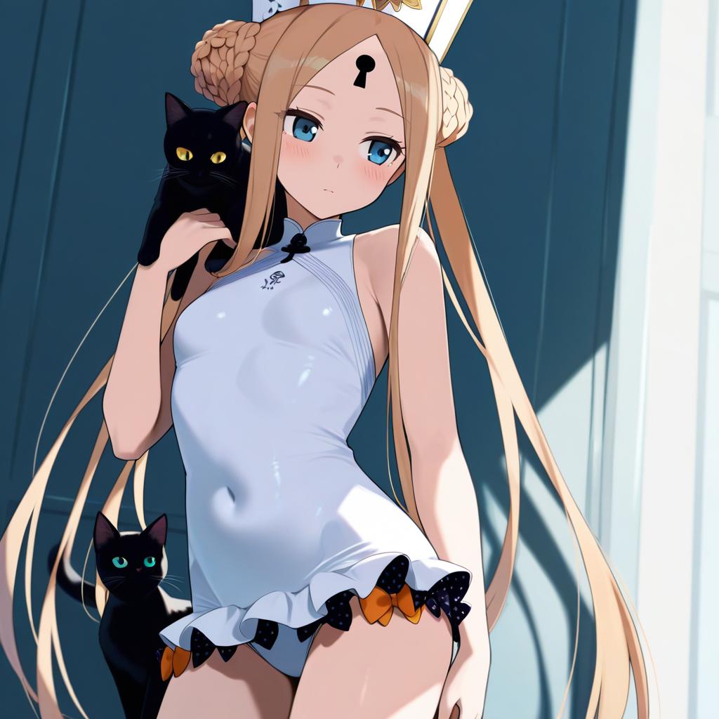 Abigail williams (swimsuit foreigner) (second ascension) (fate), fate/grand order, 1girl, blue eyes, blonde hair, very long hair, parted bangs, sidelocks, double bun, twintails, braided bun, small breasts, thighs, covered navel, white one-piece swimsuit, dress swimsuit, white headwear, bare shoulders, orange bow, black bow, multiple bows, forehead, black cat, keyhole, mitre, white hat, by artist hinami047, illustrious