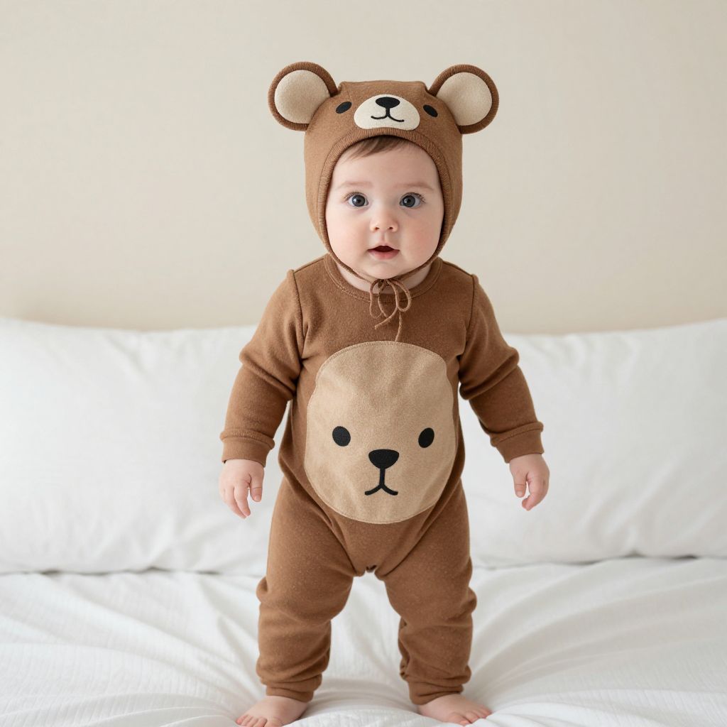 Photograph of a baby standing on a white bed, wearing a brown bear-themed onesie. The onesie features a light brown circular patch on the chest with a black bear face, and a matching bear hood with round ears. The baby has fair skin, blue eyes, and short brown hair. The background is a plain white wall, creating a soft, minimalistic setting. The onesie is made of a soft, slightly textured fabric, and the baby is barefoot. The overall image has a bright, natural light, highlighting the baby's innocent expression and the cozy, cute outfit.