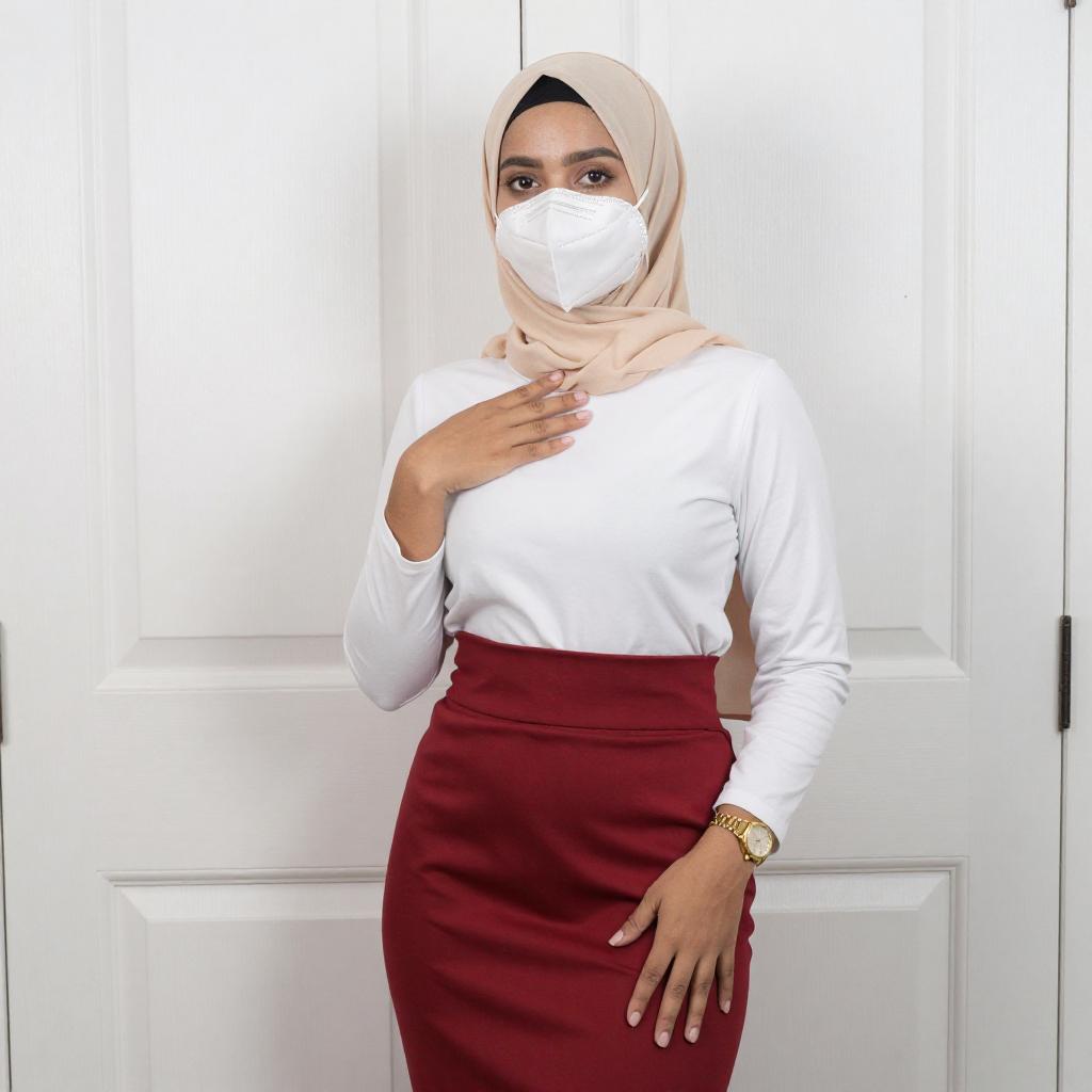 Photograph of a young woman with light brown skin and dark eyes, wearing a beige hijab, white long-sleeve top, and red high-waisted skirt. She has a beige scarf around her neck, a white face mask, and a gold watch on her left wrist. Her right hand rests on her chest, and her left hand is on her skirt. She stands in front of a white door.