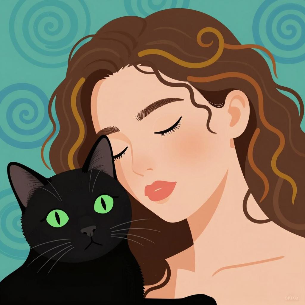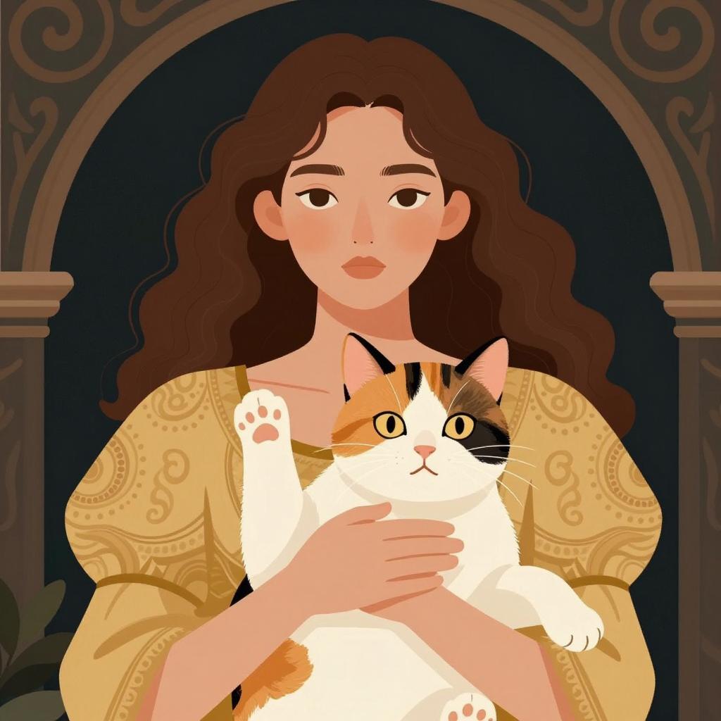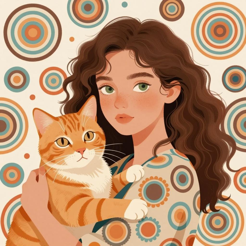 Illustration of a young woman with curly brown hair, green eyes, and freckles holding an orange tabby cat. The woman has a neutral expression, and the cat looks directly at the viewer. Both are surrounded by a of colorful, circular patterns. The woman wears a patterned garment. The cat rests its head on her shoulder. The background consists of intricate, circular designs. The woman and cat are centered, with the cat on the left and the woman's face in the middle.