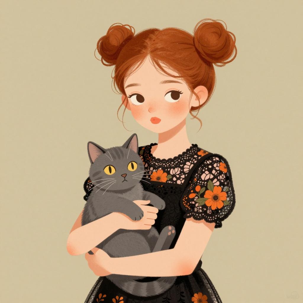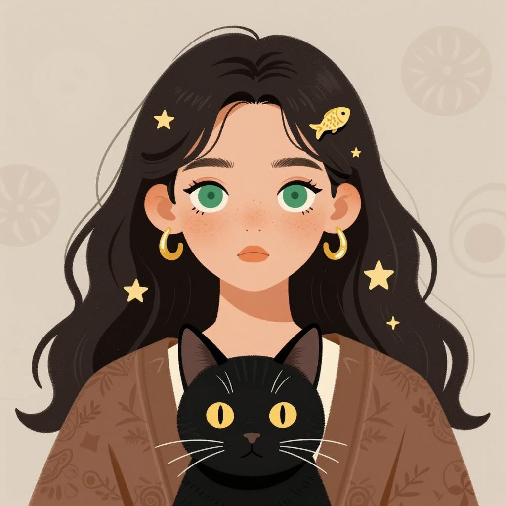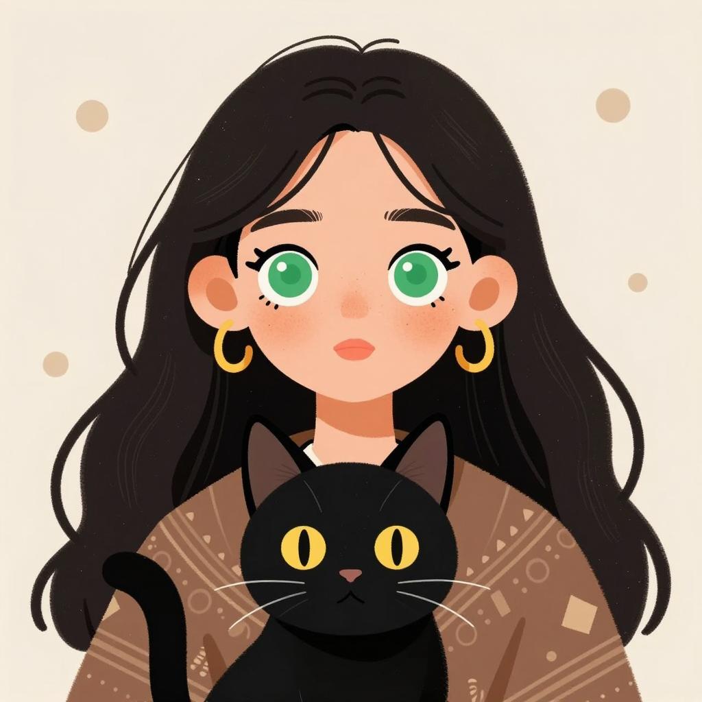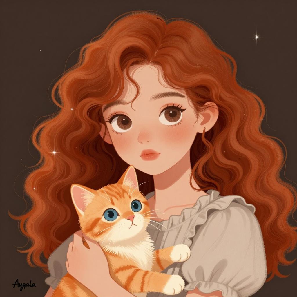 Illustration of a young woman with curly brown hair, green eyes, and freckles holding an orange tabby cat. The woman has a neutral expression, and the cat looks directly at the viewer. Both are surrounded by a of colorful, circular patterns. The woman wears a patterned garment. The cat rests its head on her shoulder. The background consists of intricate, circular designs. The woman and cat are centered, with the cat on the left and the woman's face in the middle.