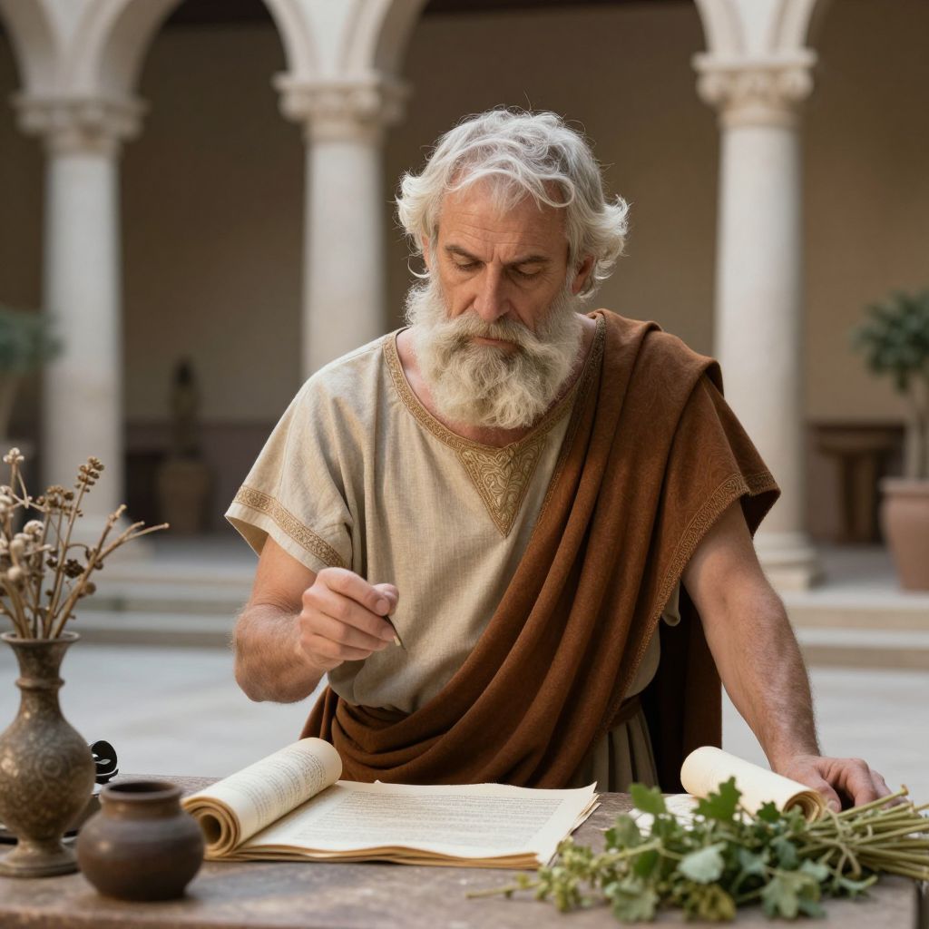 Galen, a wise ancient healer in a serene Roman courtyard, surrounded by scrolls and medicinal herbs, warm natural lighting highlighting his focused expression, classical architecture in the background, intricate details, realistic style