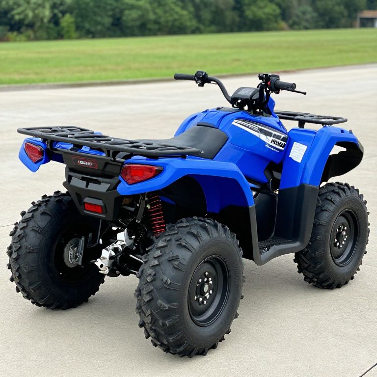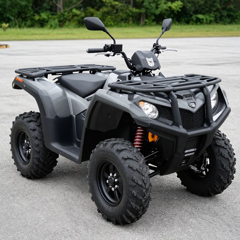 Photograph of a black, rugged, four-wheeled all-terrain vehicle (ATV) with large, knobby tires, black rims,