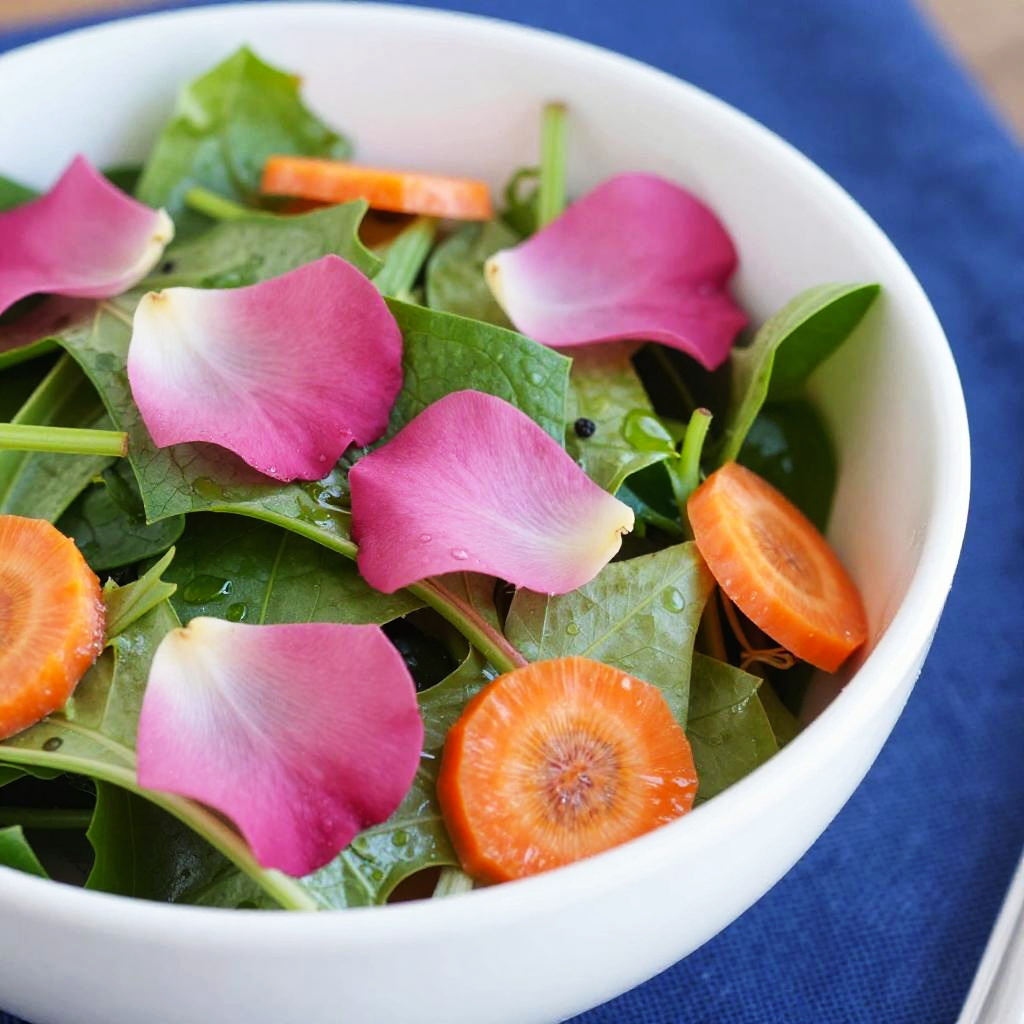 A close-up photo of a fresh salad in a white bowl. The salad features pink rose petals, vibrant green leafy vegetables, and small orange carrot slices. The background has a blue, textured cloth, adding a pop of color. The image has a bright, high-contrast style with some areas overexposed, making the colors pop.