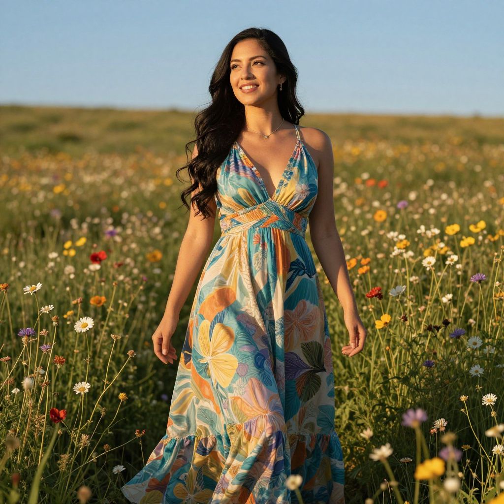 Photograph of a smiling woman with long, wavy black hair standing in a sunlit meadow filled with colorful wildflowers. She wears a sleeveless, V-neck, floral maxi dress in shades of blue, orange, and yellow, with a tie at the waist. The background shows a clear blue sky and an expansive field of flowers, including daisies, poppies, and other species. The sunlight casts a warm glow on her skin and the flowers, highlighting the vibrant colors and creating a serene, picturesque scene.